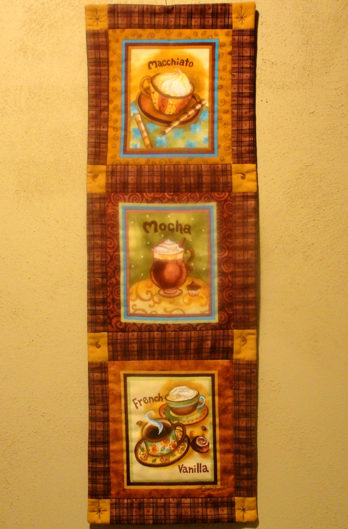I liked the style and colors of these squares that were found at a favorite quilt shop…The three were joined together with sashing and gold corner squares. After layering with a backing and batting, I quilted in-the-ditch around and with-in each block, and then used free-motion quilting to add motifs in the gold squares and sign my name & the date. Then, threadpainting was used to highlight the steam, whipped cream, and a few other details…