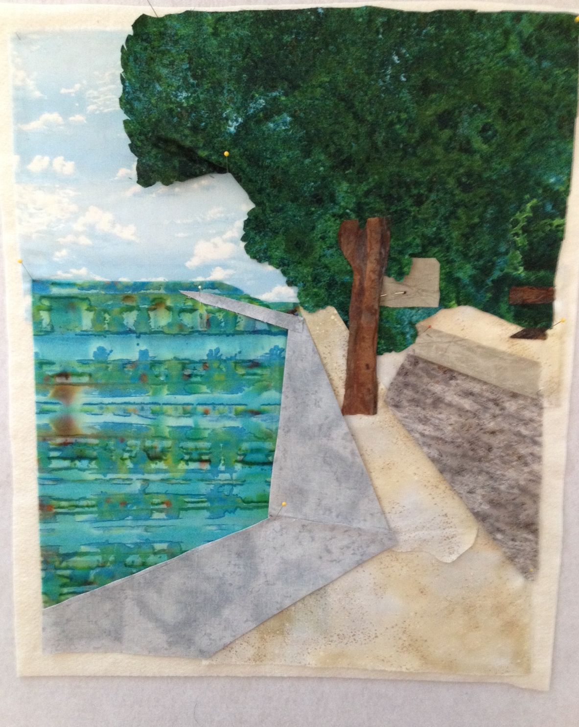 Dense-stitch quilting was used on the background elements~~the lake, trees, sky, ground and walkways~~to add texture and dimension. Using heavy threads and embroidery floss, two cables were added to tie the boats together.