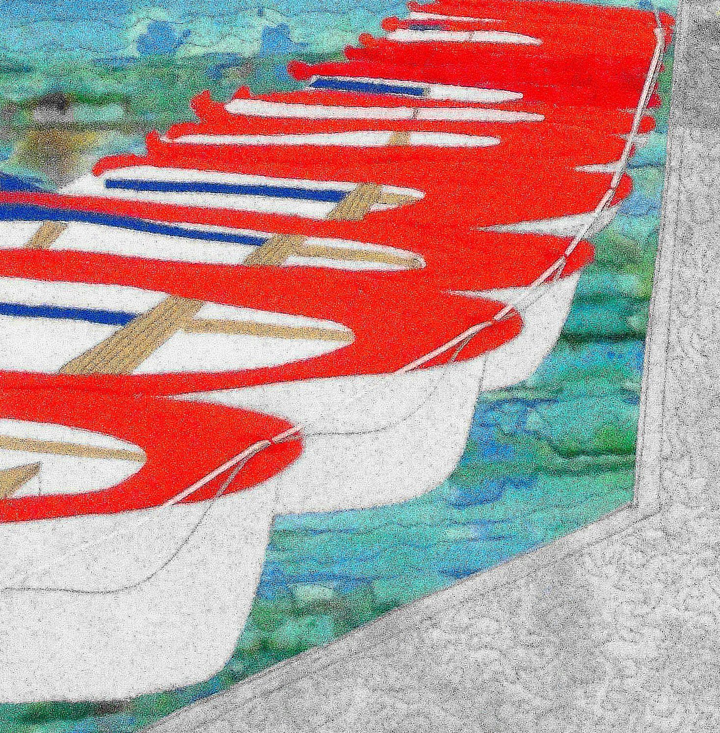The boats and the guy were constructed separately as appliques before applying them to the background.