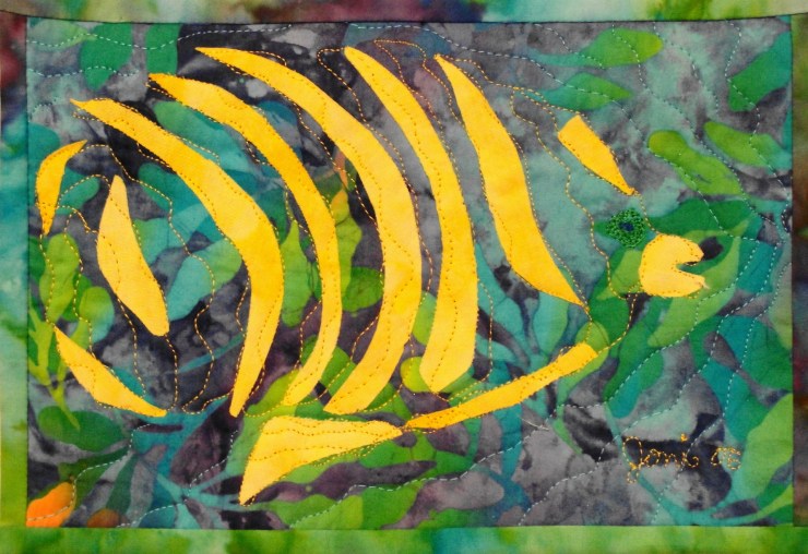 This art quilt began as an experiment in abstracting the shape of a fish into only parts, which merely visually suggested the underwater creature! Vibrant color and wavy quilt lines were the focus of the design~~This was a favorite in an ArtWalk exhibit!