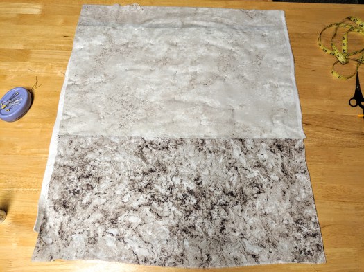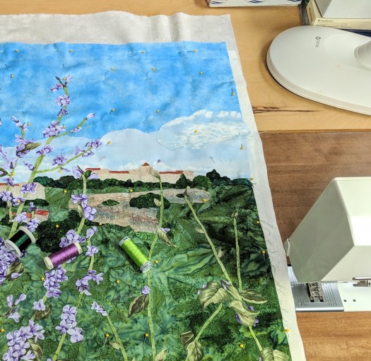 “Field at Toledo” is ready for a backing, layering the 3 layers~~top, batting, and backing, and pinning together the layers before the thread-painting and free-motion quilt stitching begins!