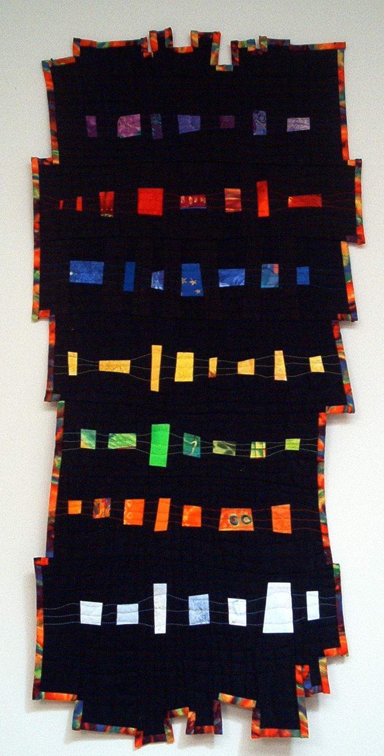 In this piece, fabric appears to be woven and quilted together. The colors represent the stages of life I have so far experienced, beginning with blue for infancy through purple–middle-age. The black symbolizes the life challenges and struggles we face daily, which in turn contributes to our strengths…