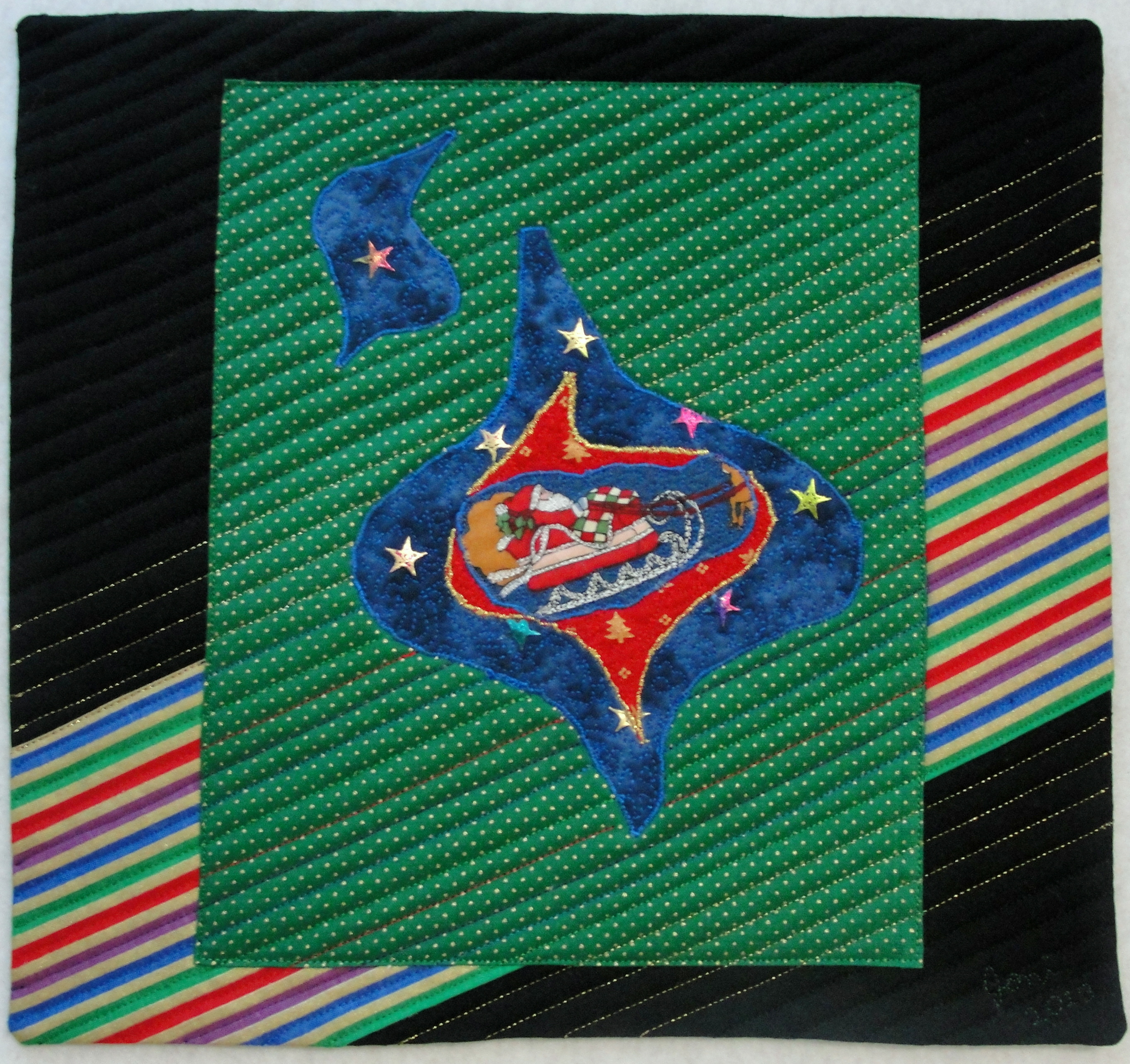 …Inspired by an ornament, its shape was cut from several printed fabrics and layered. Thread-painting was used to accent the details. Free-motion quilting was done to add dimension and movement, helping Santa soar upwards through the sky!
