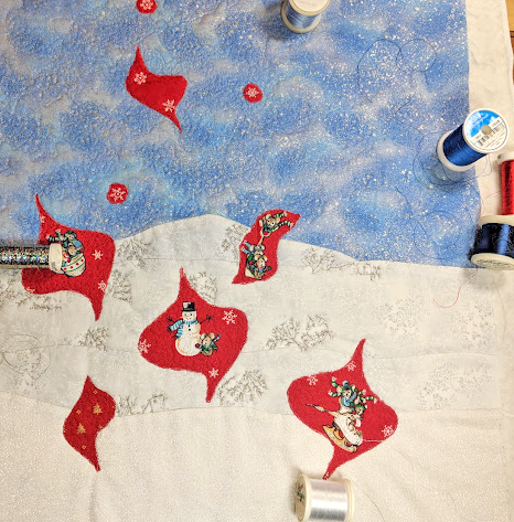 Currently in the Studio, I’m finishing a small art quilt…designing the small yellow, fractured fish for the next Sea Images piece…and preparing “Fields at Toledo” for layering, threadpainting, and quilting~~